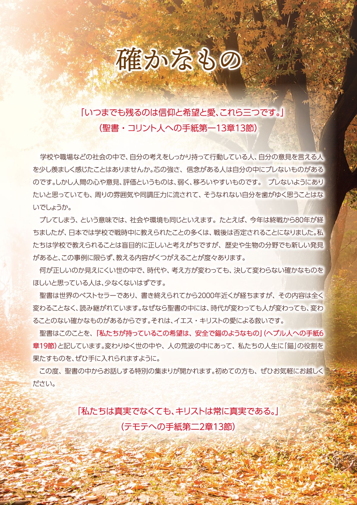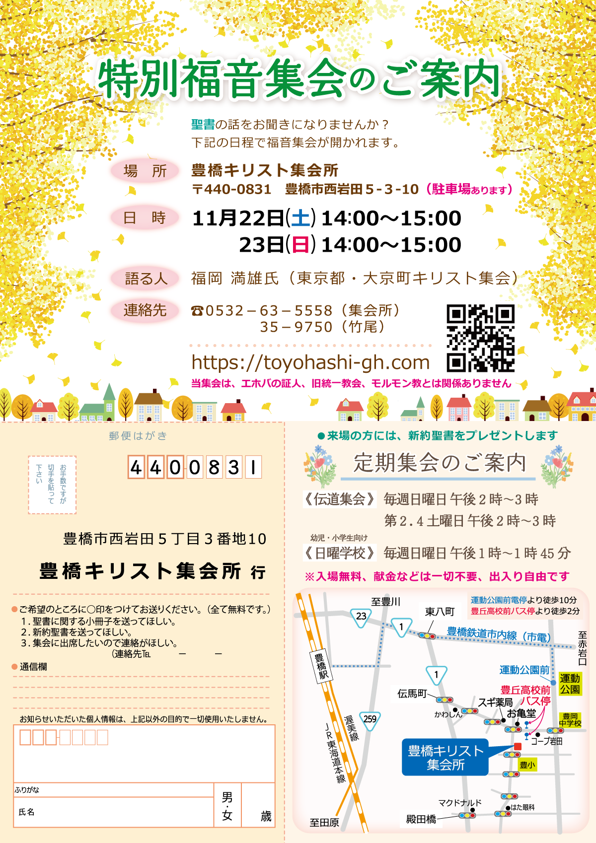 2025年秋の特別福音集会のご案内 11.22~23 最終更新日時 : 日時:2025年11月22日(土)午後2時~3時 23日(日)午後2時~3時 場所:豊橋キリスト集会所 語る人:福岡満雄氏 どなたでもご自由にお越しください。 献金等一切不要です。 Post Views: 5